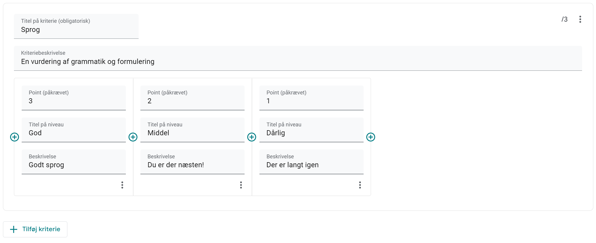 En rubrik består af en række kriterier. Når du opretter en ny, er der bare ét kriterie. Giv kriteriet et navn, en beskrivelse og en række niveauer. Tilføj flere niveauer via +knapperne