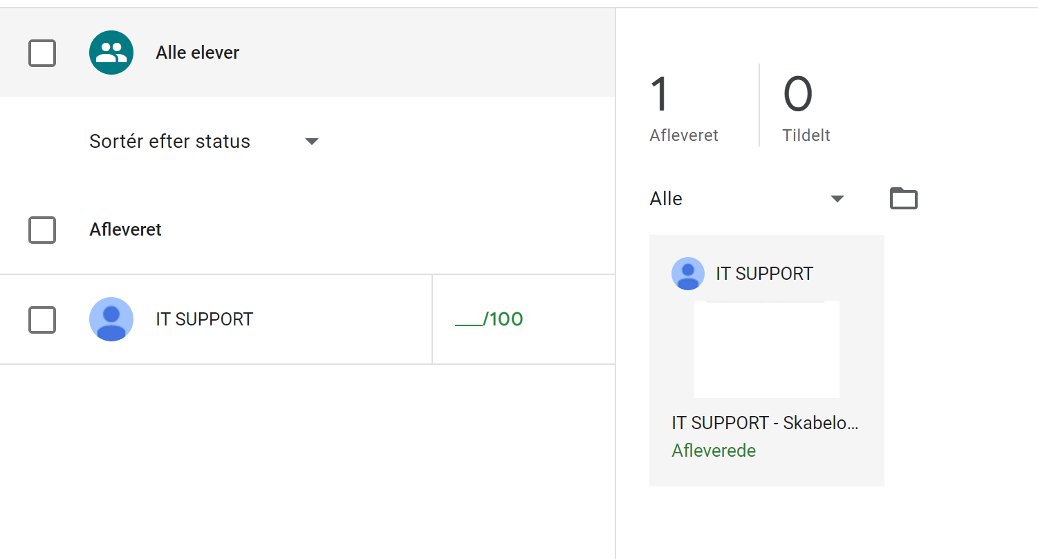 Her ser du en oversigt over alle elever og deres respektive opgaver. Hvis en opgave står som tildelt, har eleven endnu ikke afleveret, men du kan stadig se, hvad de har lavet. Tryk på mappe-ikonet for at gå til en mappe med alle elevernes afleveringer. Tryk på én af opgaverne for at rette og returnere den.