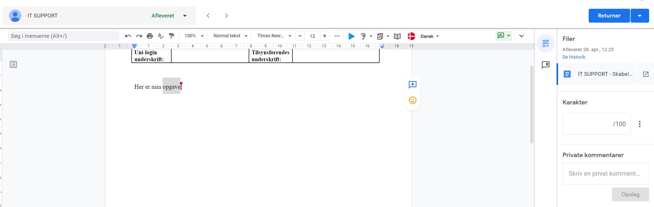 Vær opmærksom på, at “Private kommentarer” bliver sendt afsted, så snart de oprettes, mens rettelser og kommentarer i selve dokumentet først kan ses af eleven, når der er trykket Returner. Resultaterne, der tastes ind en eventuel rubrik, bliver også først tilgængelige for eleven, når opgaven returneres.