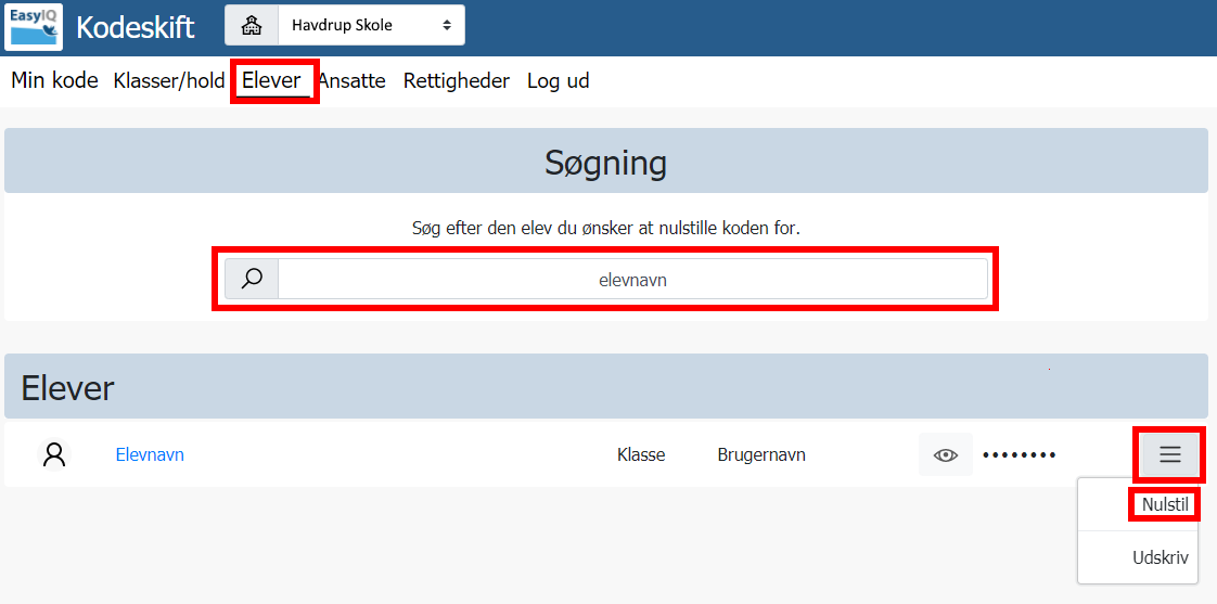 Gå til kodeskift.dk og log ind med Unilogin. Vælg Elever og indtast elevens navn i søgefeltet. Find den rigtige elev i listen og tryk på de tre streger. Vælg Nulstil
