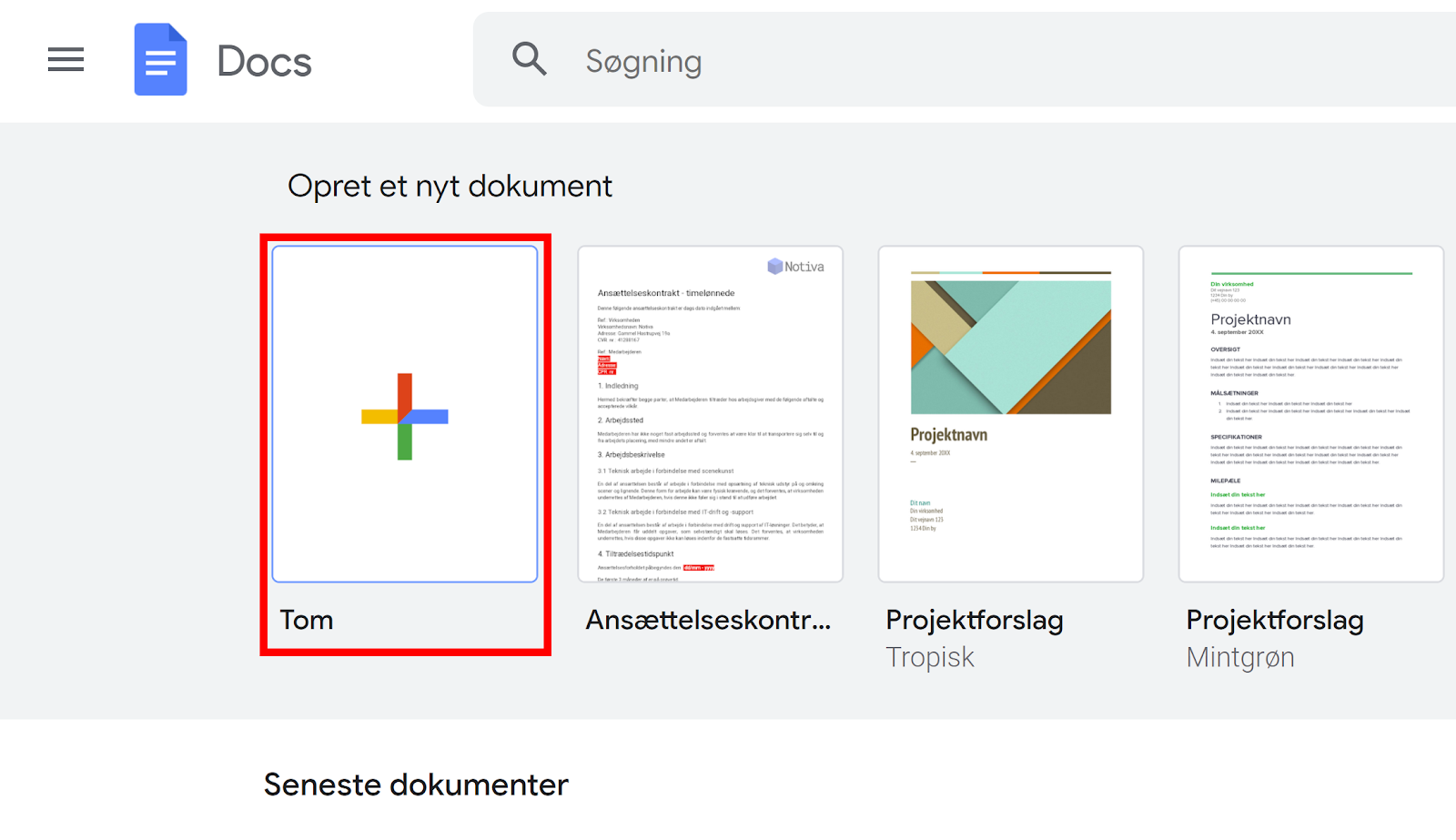 Gå til Google Docs og tryk på Tom under Opret nyt dokument