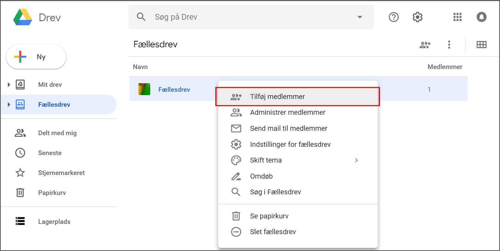 Hvis din kollega har adgang til et fællesdrev, som du har brug for at kunne tilgå, kan du bede om at få drevet delt med dig. Et drev deles ved at højreklikke på drevet i oversigten på http://drive.google.com > Fællesdrev og vælge “Tilføj medlemmer”