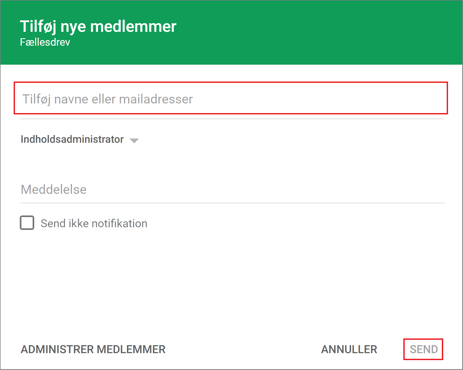 Efter de relevante kollegaer er valgt, trykkes der på SEND for at dele drevet.