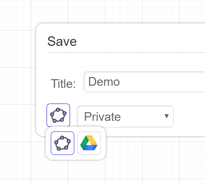 Når vinduet er lukket, skal GeoGebra lukkes og genåbnes. Tryk herefter på de tre streger i øverste højre hjørne og vælg “Gem”, ligesom tidligere. Denne gang burde følgende boks dukke op. Tryk på GeoGebra-logoet og vælg Google Drive-logoet, når det dukker op.