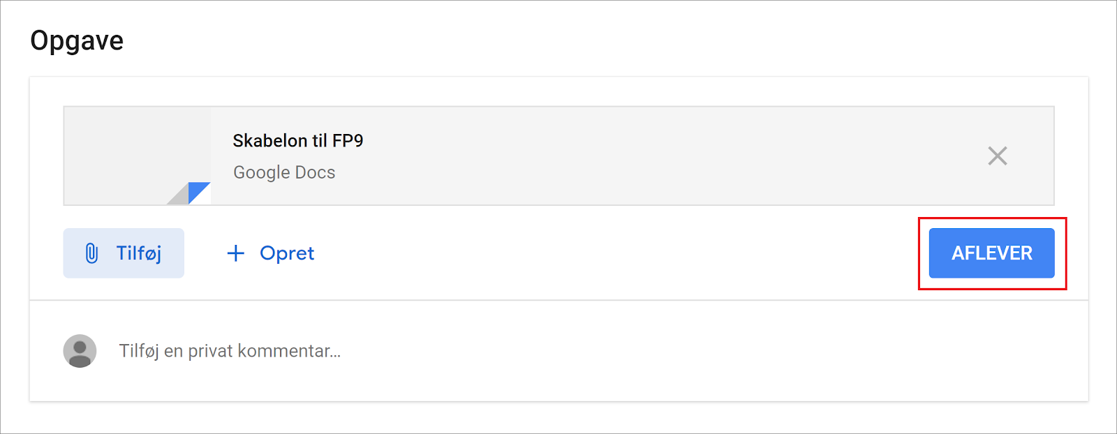 Hvis man har arbejdet direkte i den tildelte skabelon, vil den blive afleveret, når der trykkes Aflever. Alternativt kan der tilføjes filer via Tilføj. Afleveringen er endelig, så kontroller dokumenterne, inden de indsendes.