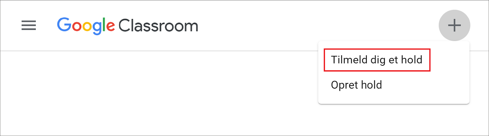 Gå til classroom.google.com, log ind og tryk på + i øverste højre hjørne og vælg Tilmeld dig et hold