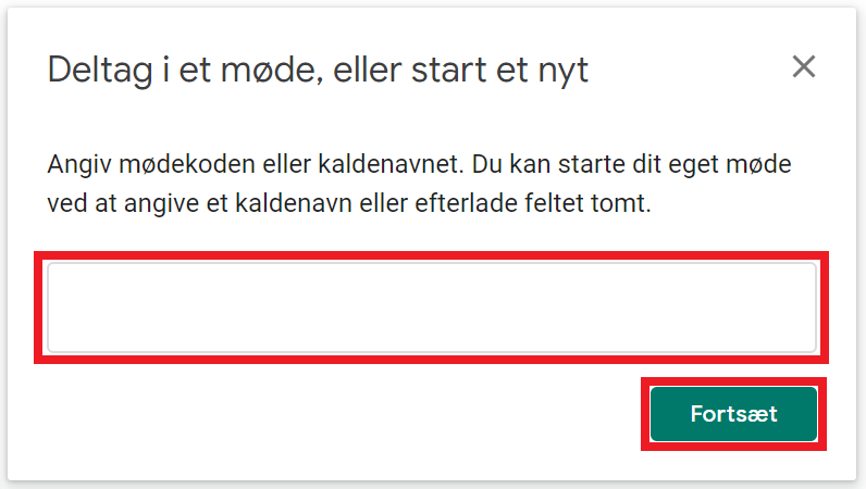 Gå til http://meet.google.com og tryk Deltag i et møde, eller start et nyt