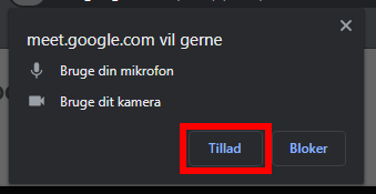 Gå ind på det link, som du har modtaget fra mødets arrangør. Linket har dette format: http://meet.google.com/aaa-bbbb-ccc . For at kunne deltage i mødet, skal du acceptere, at hjemmesiden har adgang til mikrofonen og kameraet på din computer. I Google Chrome gøres det ved at trykke Tillad på den boks, der popper op i øverste, venstre hjørne af vinduet.