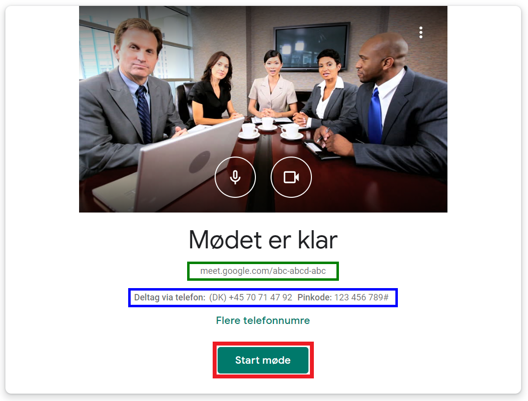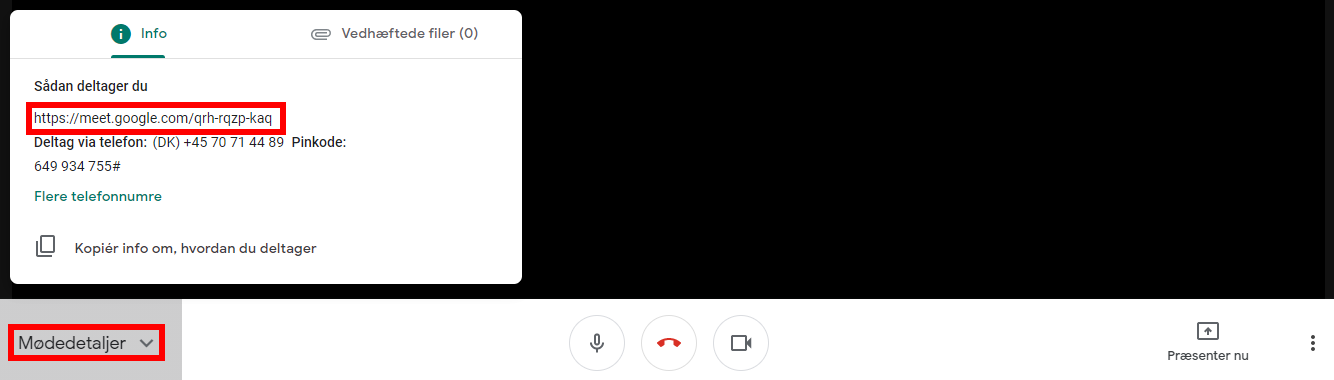 Linket (markeret med grønt) eller telefon-nummeret m. pinkode (markeret med blåt) kan med fordel sendes til mødedeltagerne, inden mødet startes. Ellers kan det hentes efter mødetstart ved at trykke på Mødedetaljer