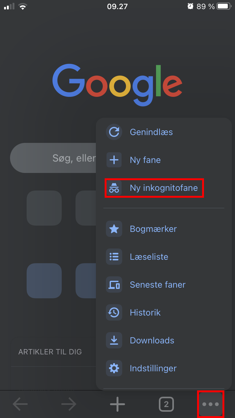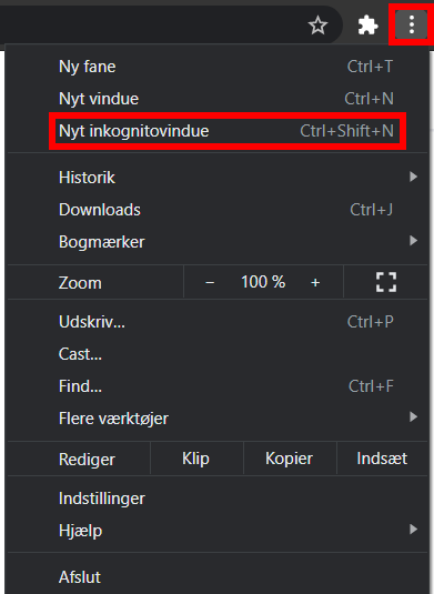 Tryk på de 3 prikker i øverste højre hjørne og tryk Nyt inkognitovindue