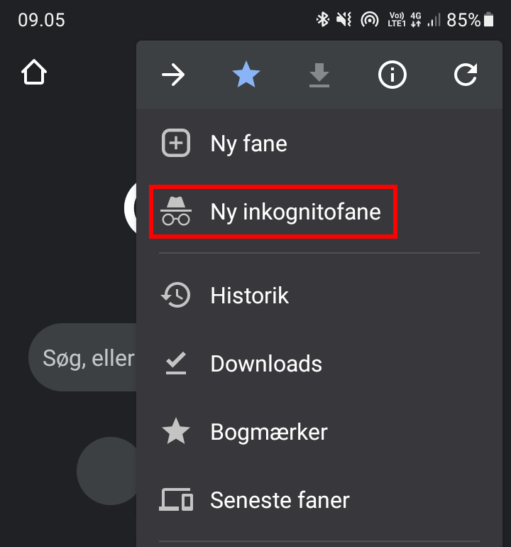 Tryk på de 3 prikker i nederste, højre hjørne af skærmen og vælg Ny inkognitofane