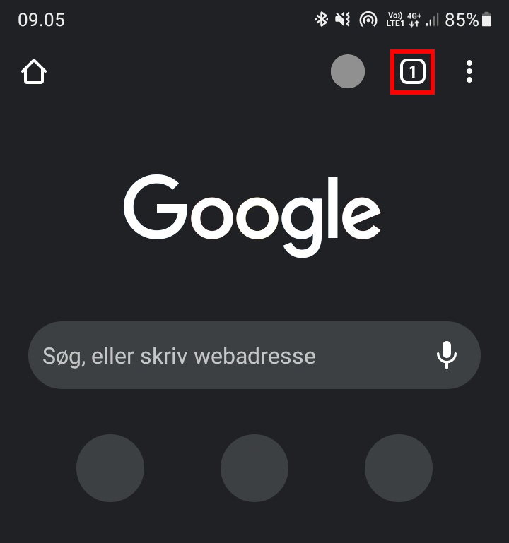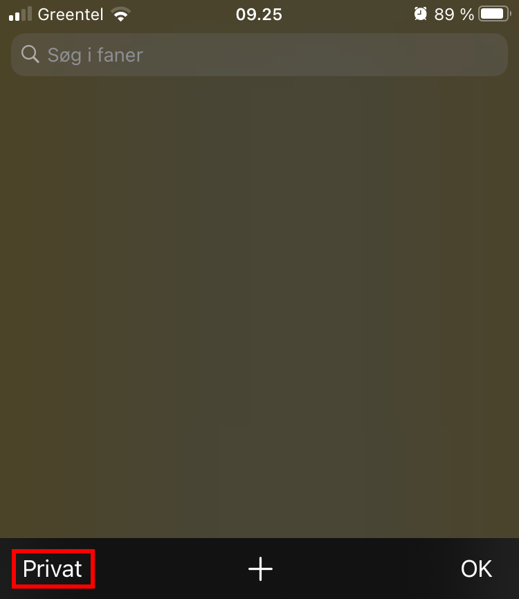 Når Privat står mørk på hvid baggrund, ser du dine Inkognito-faner. Luk dem og tryk på Privat igen for at slå Inkognito fra.