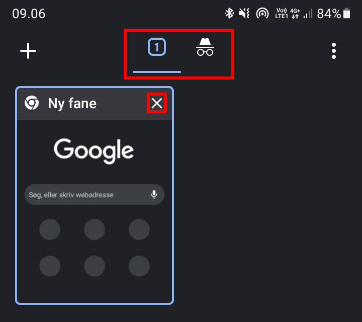 Her kan du vælge mellem Inkognito og almindelige faner i toppen eller lukke faner via de små kryds på hver fane