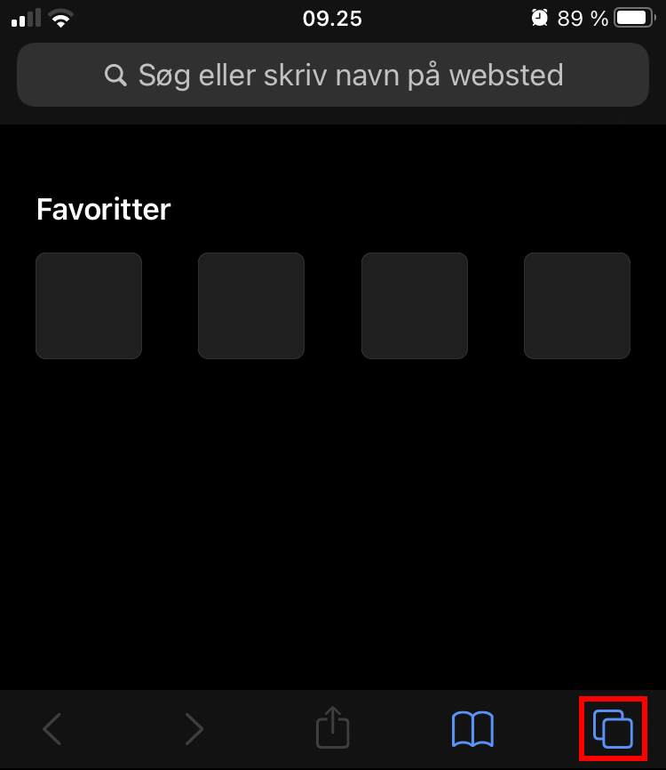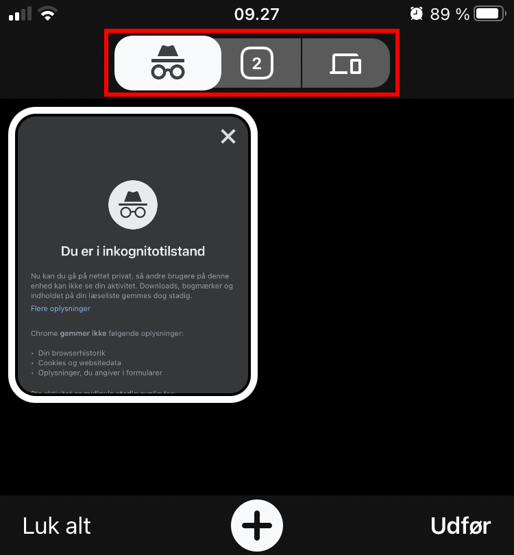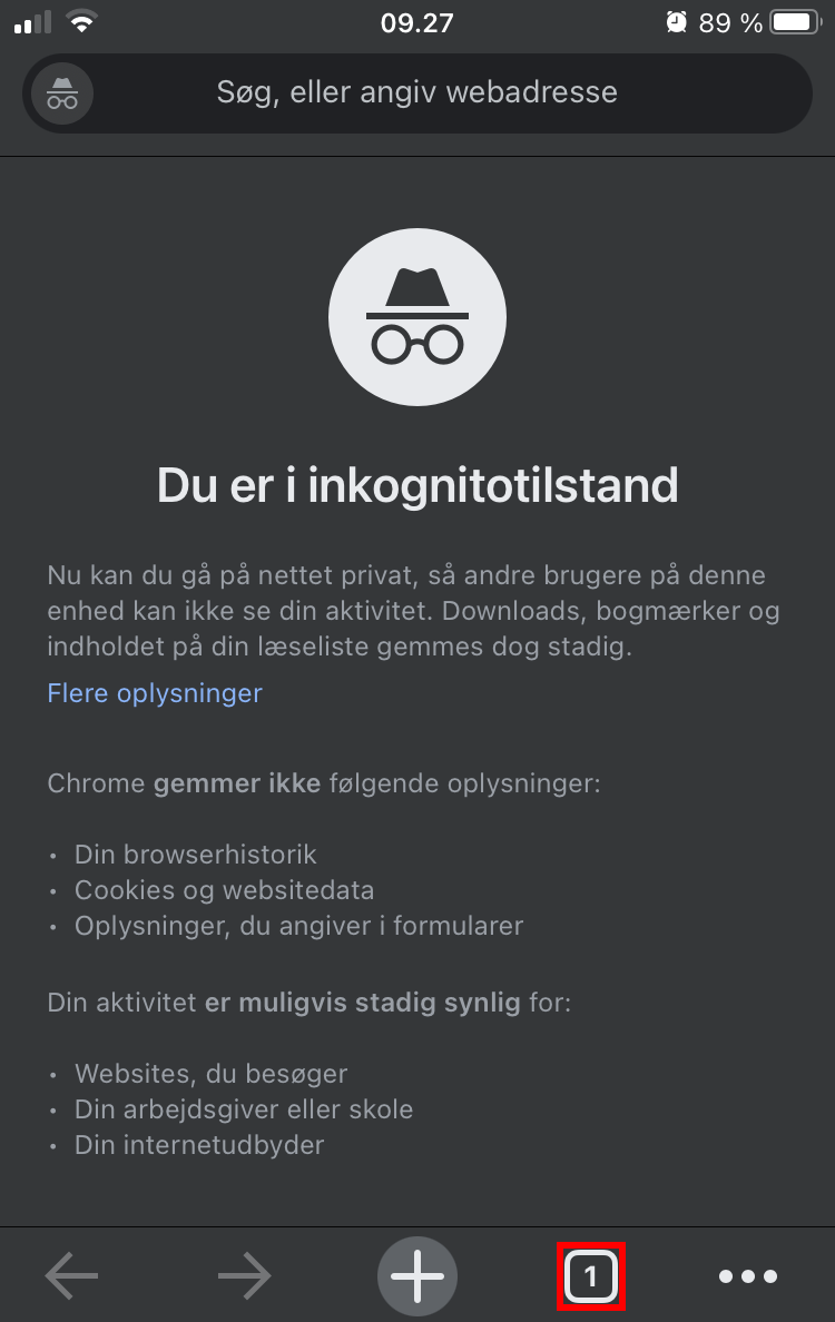 Du er nu i Inkognito! Skift mellem Inkognito og almindelige faner ved at trykke på firkanten i bunden af skærmen