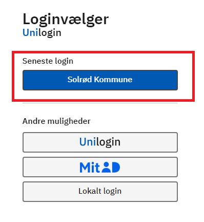 Fremover behøves du ikke at vælge lokalt login og søge efter Solrød, når du skal logge ind. Du kan nøjes med at bruge Seneste Login