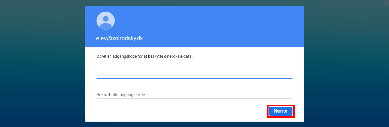 Inden man bliver låst ind på chromebooken, bliver man dog bedt om at indtaste en adgangskode “for at beskytte dine lokale data”, som det ses i nedenstående billede. Denne kode synkroniseres ikke med uni-login, og den virker kun lokalt på enheden. Man får aldrig brug for den igen, og der er ingen krav til komplexiteten, så vi anbefaler, at man bare bruger ét tegn. Tryk Næste, når koden er indtastet i både øverste og nederste felt.