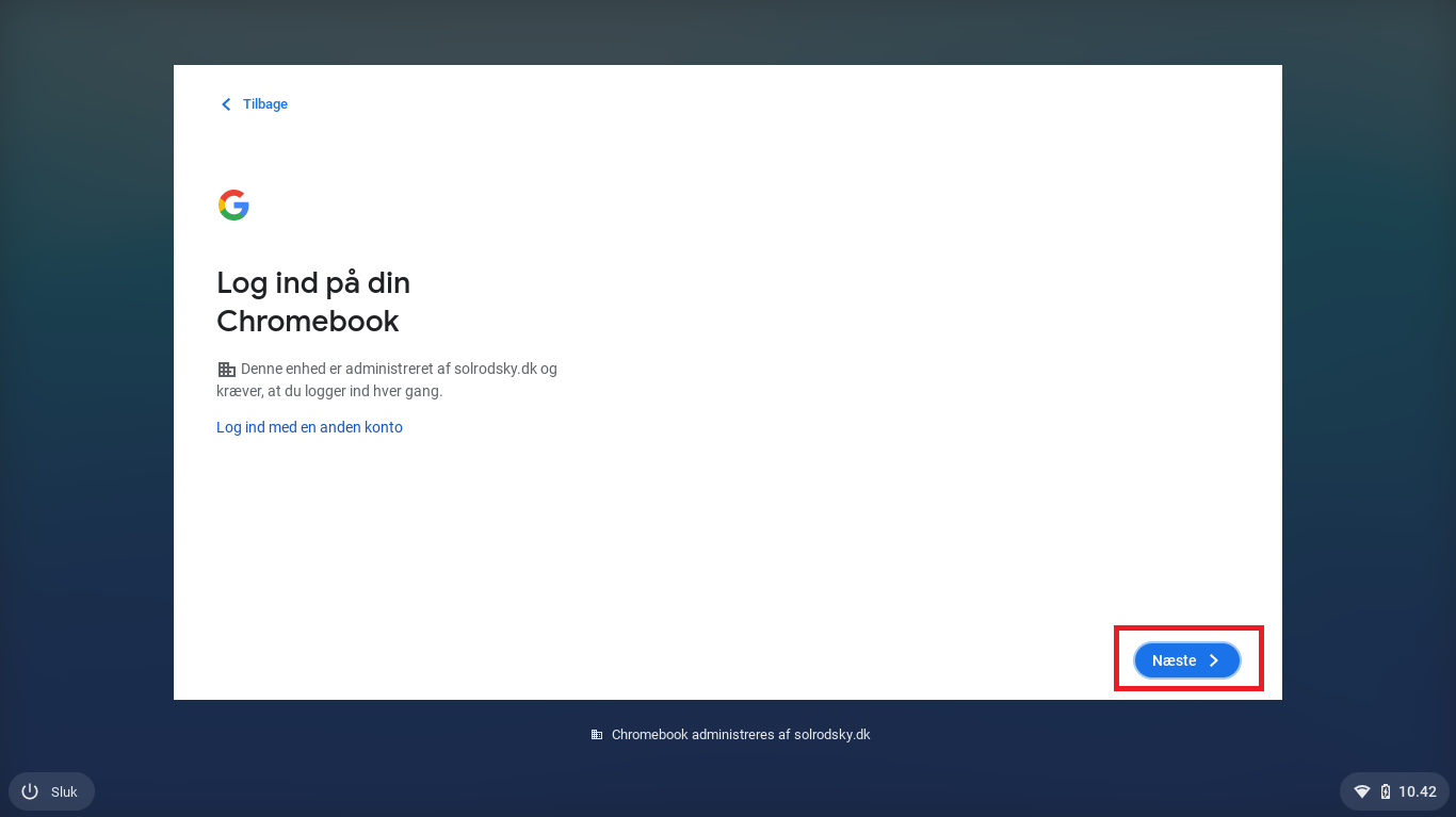 For elever fra 3. klasse og op samt skolens personale har login på chromebook ikke ændret sig. Tryk Næste i det vindue, der viser sig, når man åbner enheden. Efter indtastning af Uni-login og adgangskode vil enheden låses op. Herefter kan den låses midlertidigt ved at lukke låget eller ved at trykke på + L