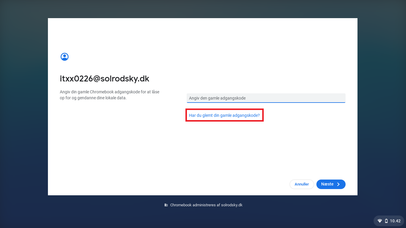 I få tilfælde vil man blive bedt om sin “gamle Chromebook adgangskode”, når man logger på en enhed. Hvis eleven ikke kan huske denne, kan der trygt trykkes Har du glemt din gamle adgangskode?. Det vil ikke have andre konsekvenser end, at downloads-mappen på enheden bliver ryddet. Skolens IT-personale kan ikke hjælpe med at genskabe lokale adgangskoder - men det burde aldrig blive nødvendigt.