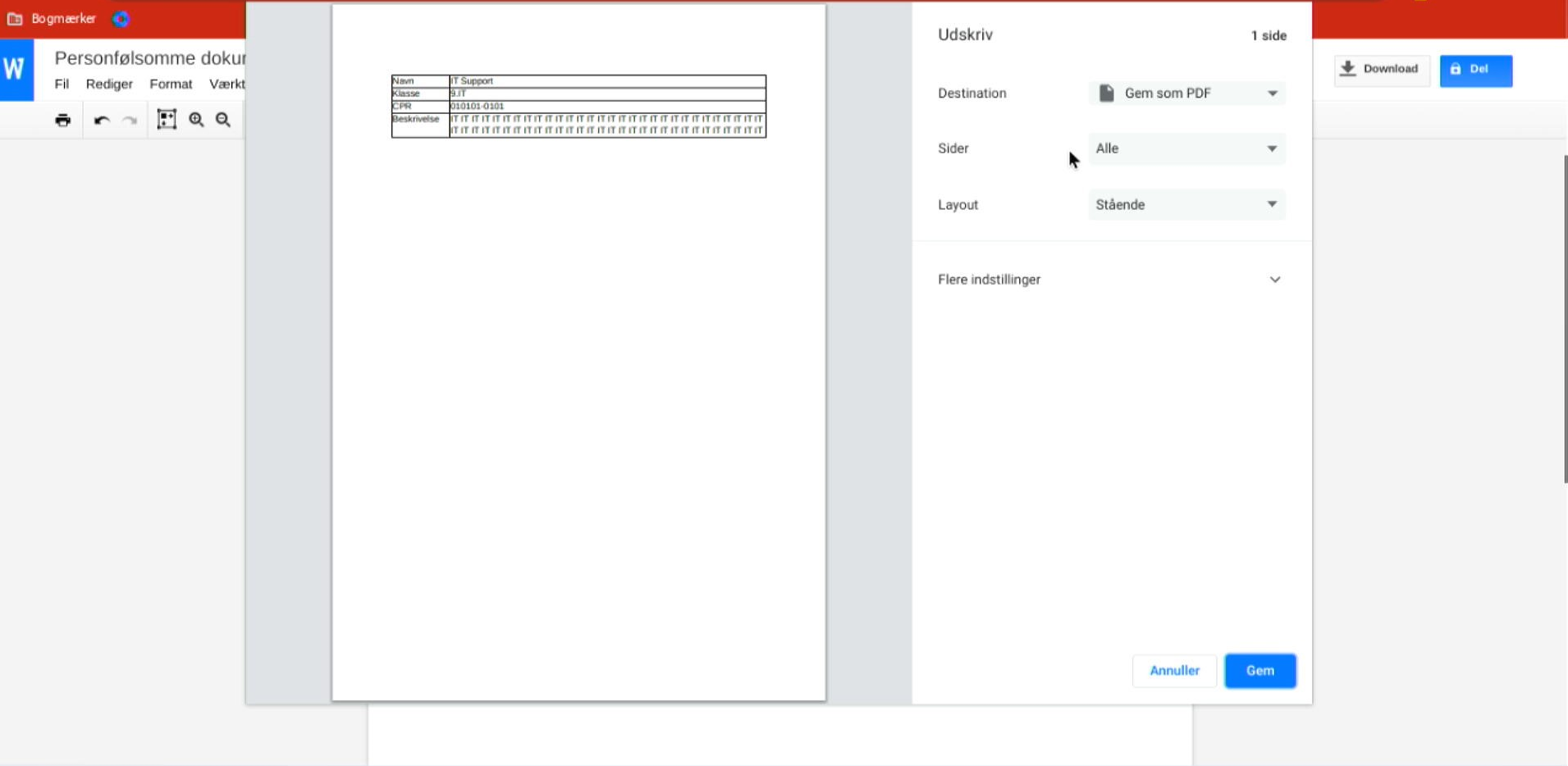 Hvis du gerne vil download filen som en PDF i stedet for en .docx fil, skal du i stedet for at trykke Download gå til Fil > Udskriv og vælge Gem som PDF som Destination, tryk på Gem og på Gem igen i den næste menu.