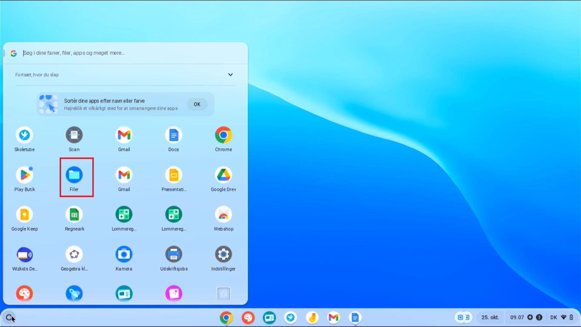 Du vil nu få en oversigt over alle dine Apps, klik på ikonet Filer enten ved at finde den i oversigten, eller ved at skrive Filer i søgebaren øverst