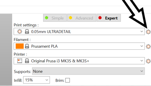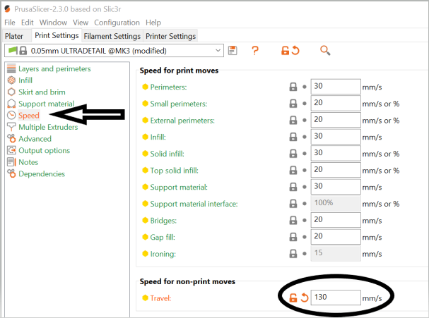 Hvis et småt/fint print giver problemer i opstartsfasen af printet, kan det være fordi printeren bevæger sig for hurtigt når den flytter dyssen. Dette kan ændres i PrusaSlicer soffwaren.