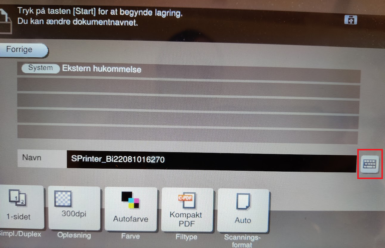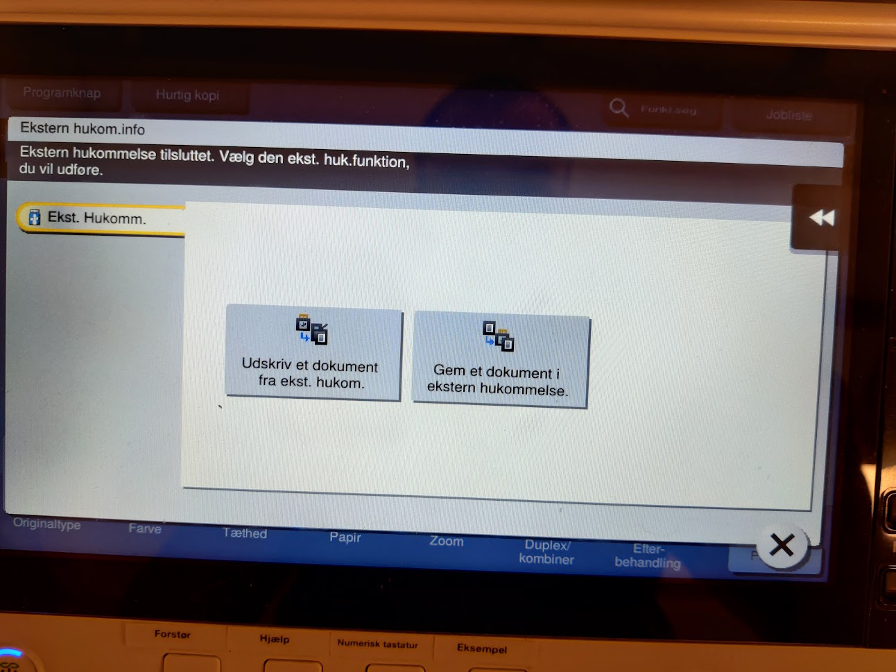 Når printeren har registreret drevet, vil følgende menu komme frem. Her skal “Gem et dokument i ekstern hukommelse” vælges