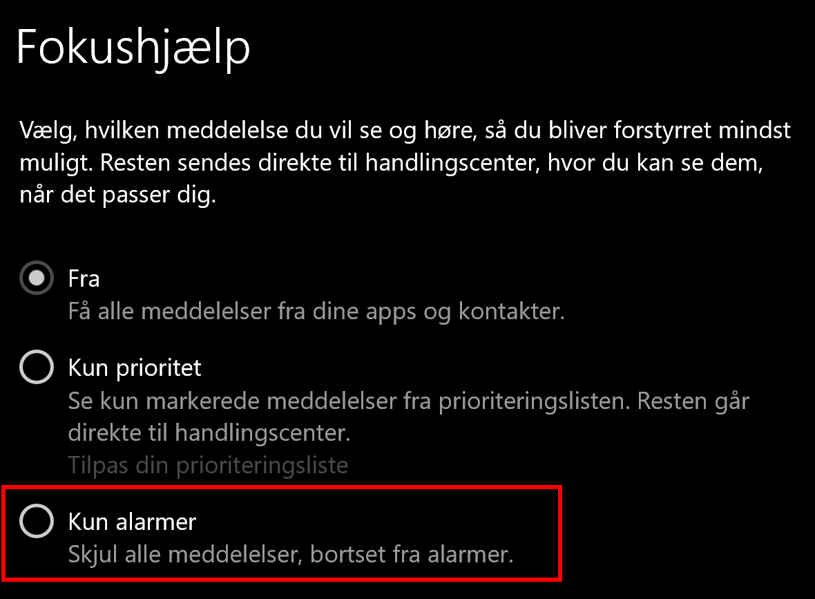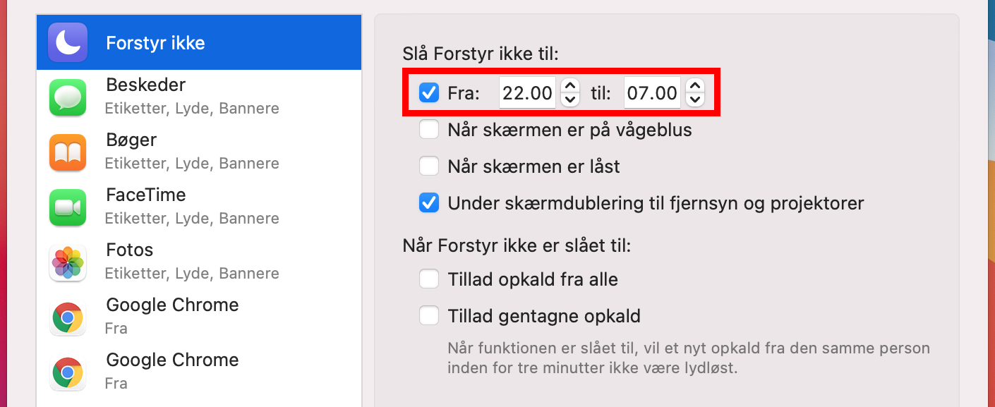 Indstil et tidsinterval, hvor notifikationer skal være slået fra. I en prøvesituation kunne det være fra 08.00 til 15.00