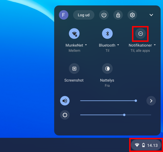 Tryk på tiden i nederste, højre hjørne og vælg (minus)-ikonet ved Notifikationer.