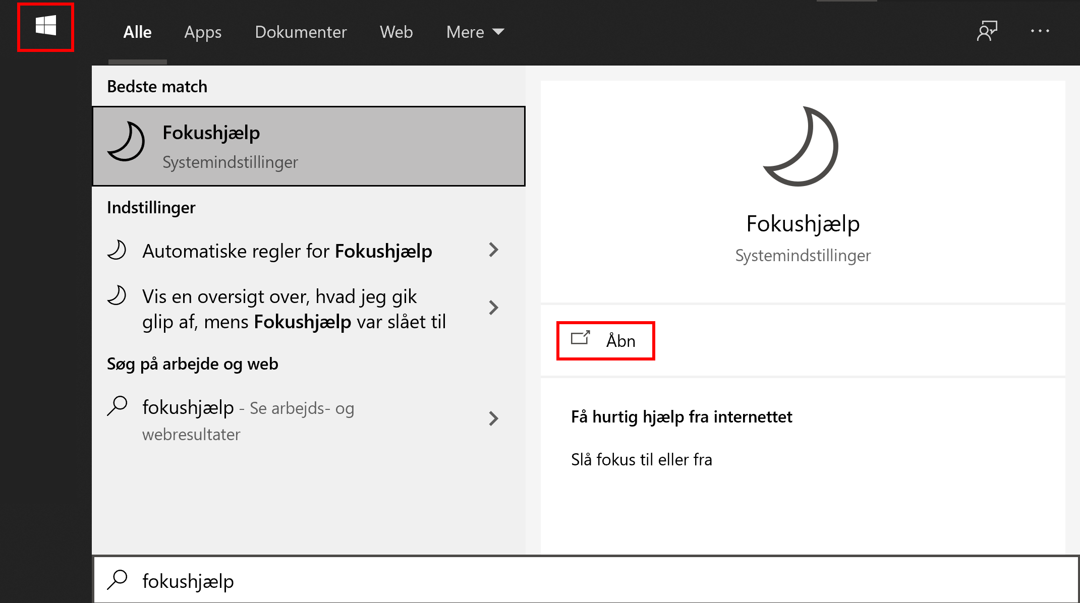 Tryk på Windows-tasten på tastaturet eller i hjørnet af skærmen og skriv “Fokushjælp” og vælg “Åbn” i menuen, der dukker op