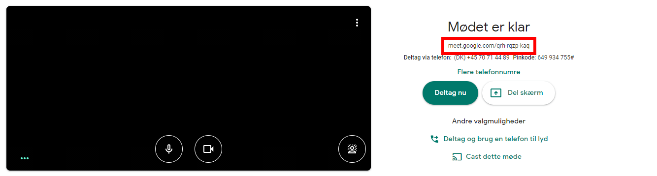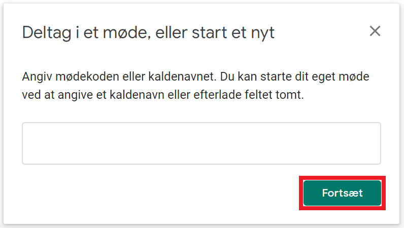 Gå til http://meet.google.com og tryk Deltag i et møde, eller start et nyt