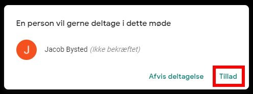 Send linket til de eksterne deltagere. Når de går ind på linket og anmoder om deltagelse, vil der poppe en boks op på din skærm. Tryk Tillad for at lukke personen ind