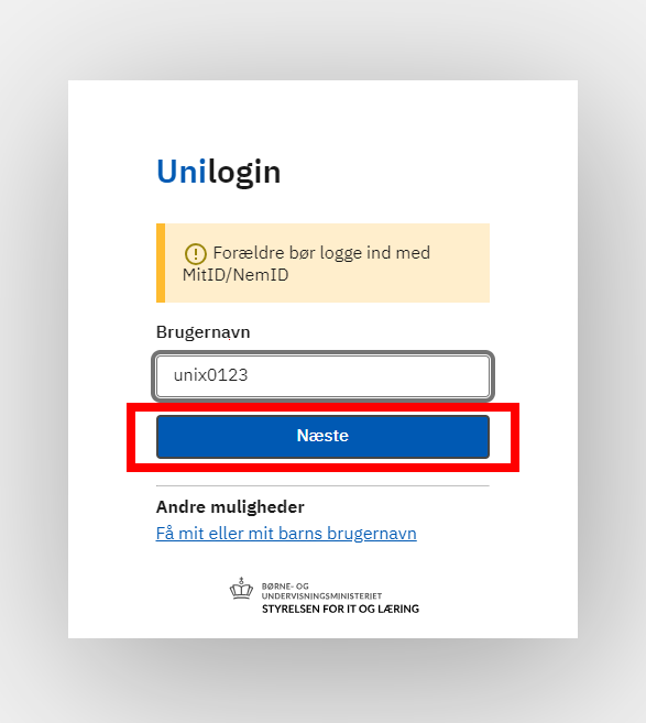 Skriv dit barns Unilogin og tryk Næste