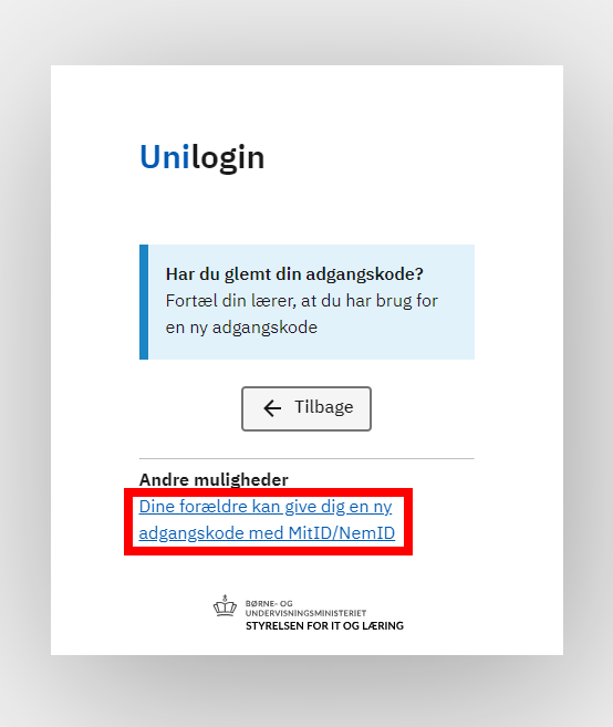 Vælg Dine forældre kan give dig en nye adgangskode med MitID/NemID