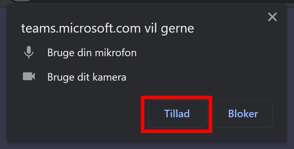 Sørg for, at Teams har tilladelse til at bruge din mikrofon og kamera, så resten af mødets deltagere kan se og høre dig.