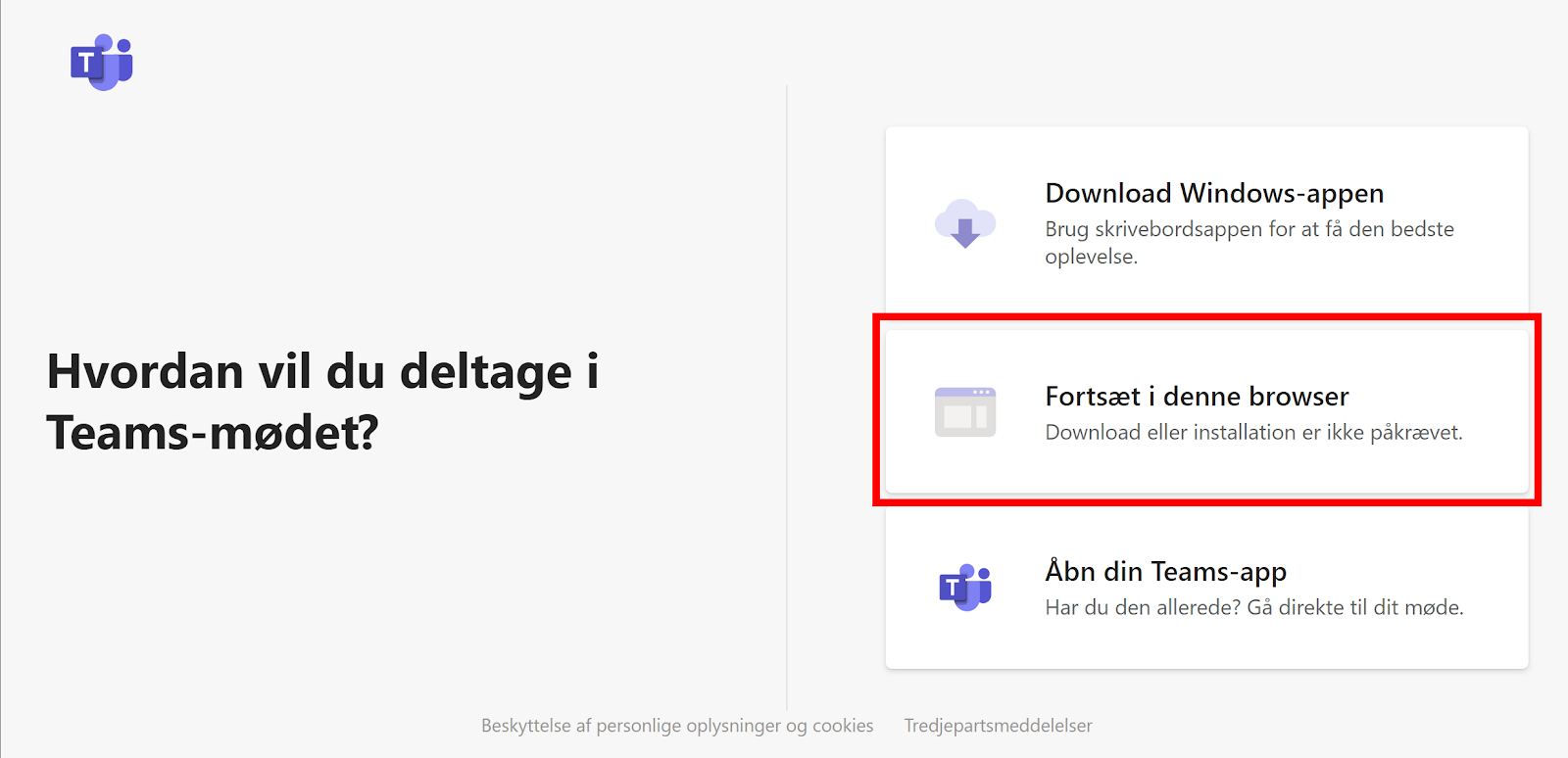 Inden forældremødet modtager du en besked via mail eller Aula. I beskeden er der blandt andet et link med titlen Deltag i et forældremøde via Teams. Vi anbefaler, at du bruger Chrome-browseren. Tryk på linket for at blive sendt videre til følgende side. Tryk på Fortsæt i denne browser