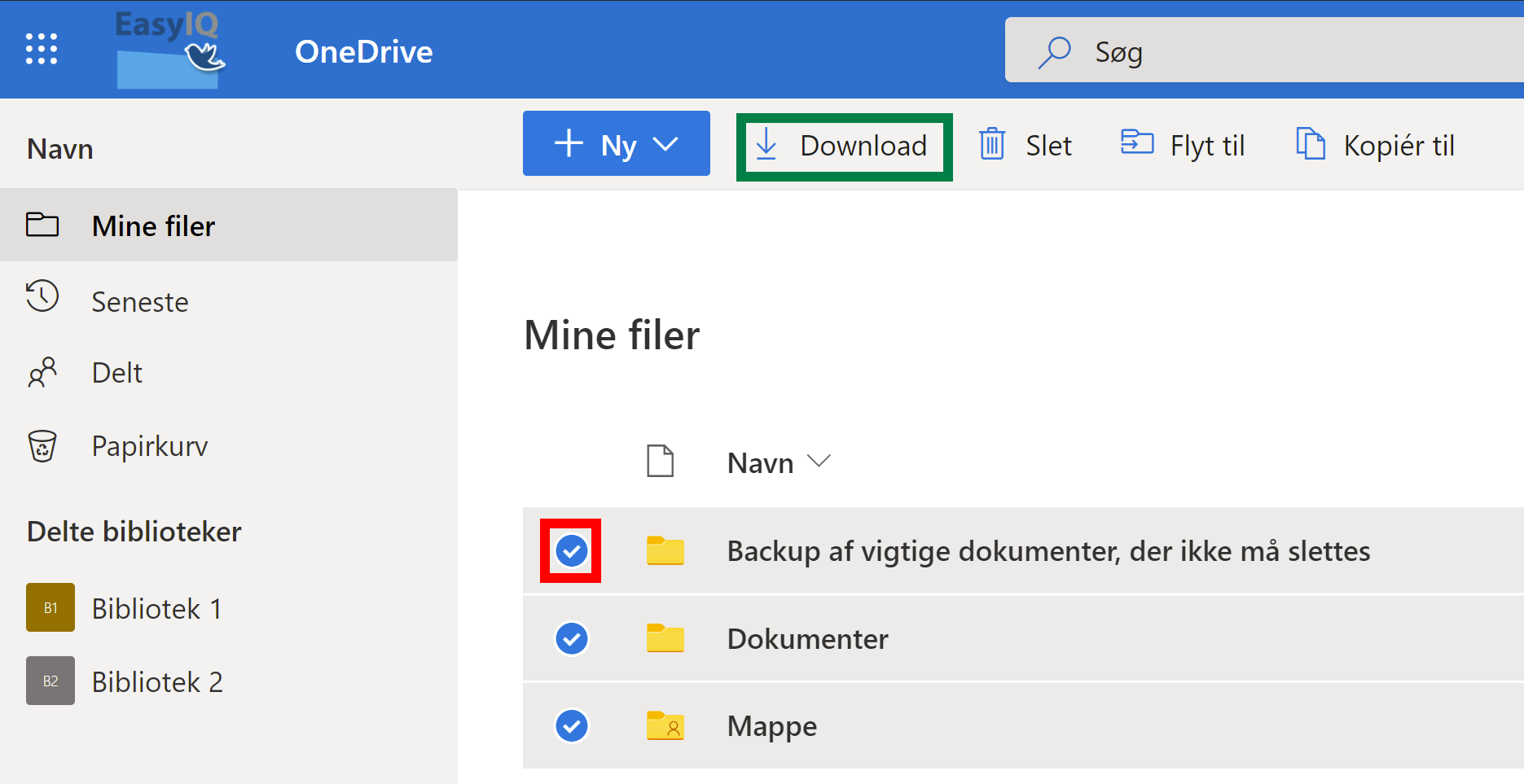 Gå til OneDrive og log ind med din @koegeskoler.dk-adrese. Vælg alle de filer og mapper, som du vil beholde, ved at trykke på fluebenene ud for mapperne. Tryk derefter Download for at hente alle de markerede mapper.