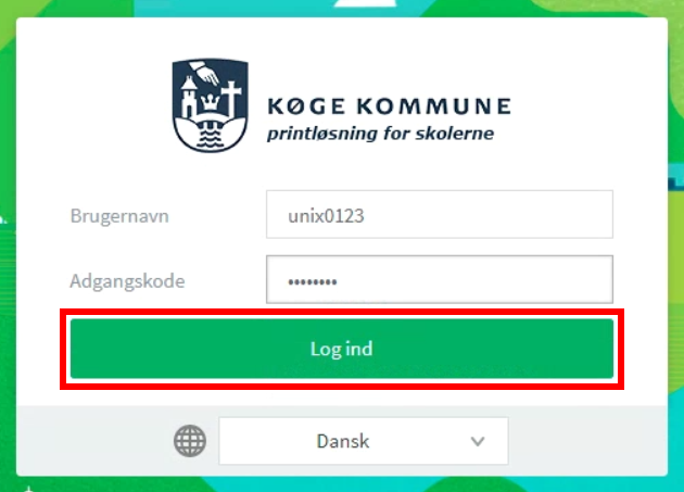 Gå til vemprint.koege.dk og log ind med Unilogin. Det er samme kode, som til skolens computere, eller til @koegeskoler.dk. Hvis du ikke kender den, kan du skifte den via denne vejledning