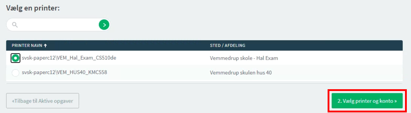 Vælg en printer på listen og tryk 2. Vælg printer og konto