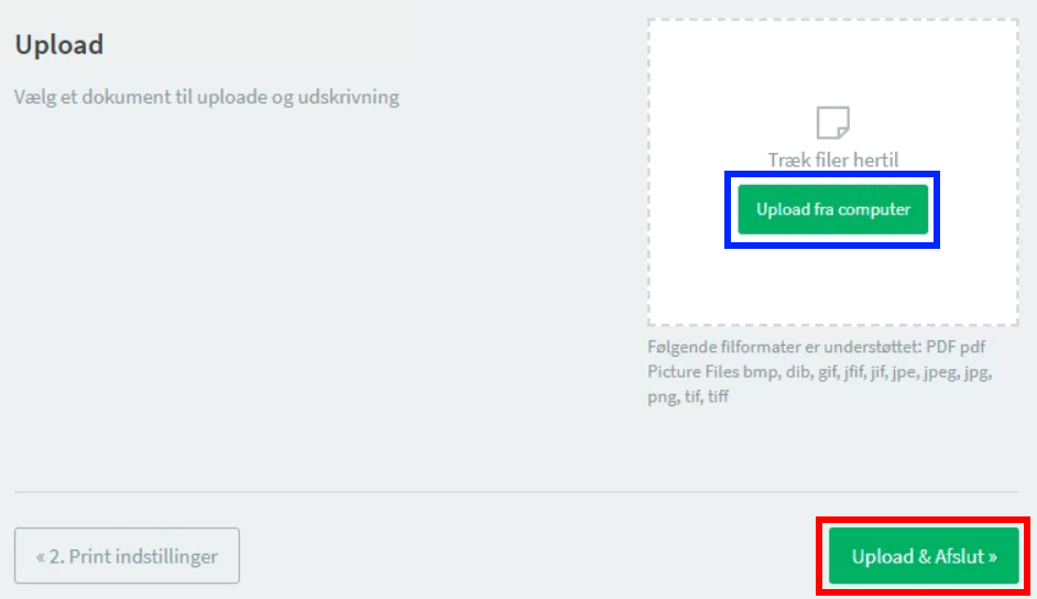 Upload den ønskede fil via Upload fra computer og tryk Upload og afslut. Husk, at den uploadede fil ikke må være en Word-fil. Se denne vejledning, for at lære, hvordan du konverterer til PDF.