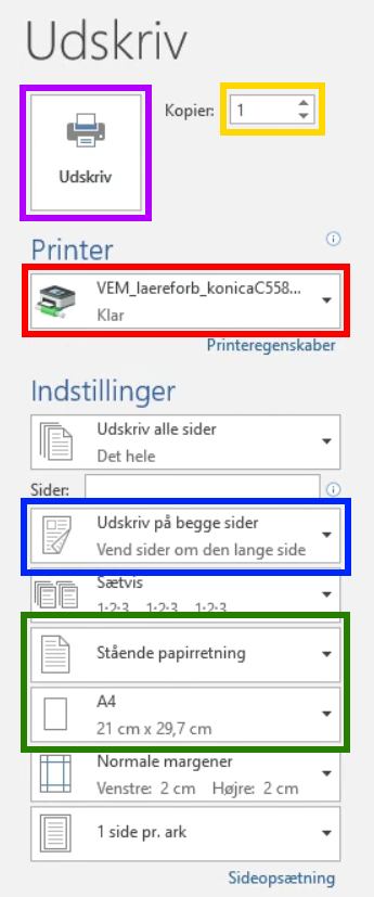 I udgangspunktet printer den på begge sider. Det ændres ved at trykke på Udskriv på begge sider