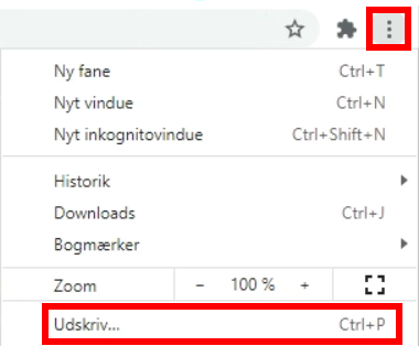 Tryk på Ctrl + P eller på de tre prikker i øverste, højre hjørne og vælg Udskriv