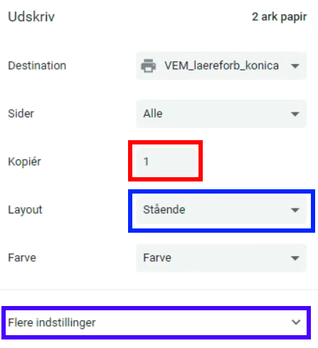 Vælg antal og papirretning. I udgangspunktet printer den på begge sider. For at undgå det, vælg Flere indstillinger