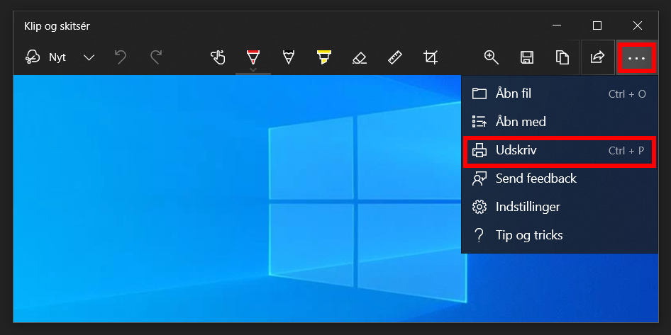 Når du har skærmbilledet åbent i Klip og skitsér, tryk på Ctrl + P eller på de tre prikker i øverste, højre hjørne og vælg Udskriv