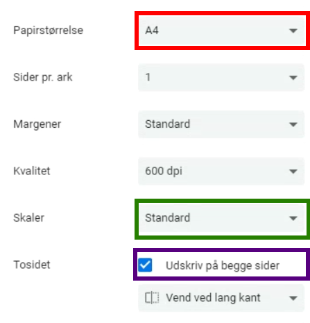 Her kan du vælge Papirstørrelse, og om indholdet skal skaleres. Det er også her, du kan vælge, om der skal udskrives på begge sider