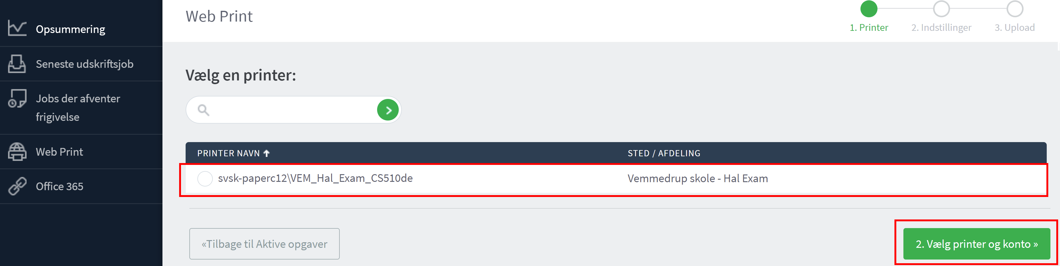 Vælg den rigtige printer. Til prøverne bruges VEM_Hal_Exam_CS510de. Vælg derefter 2. Vælg printer og konto