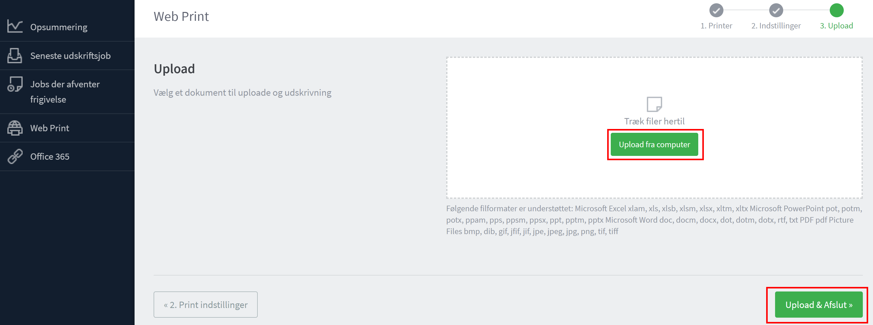 Træk et dokument til det grå område eller vælg Upload fra computer. Når dokumentet er på plads, tryk Upload & Afslut