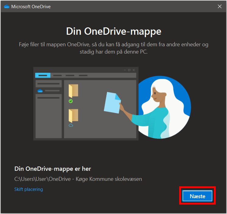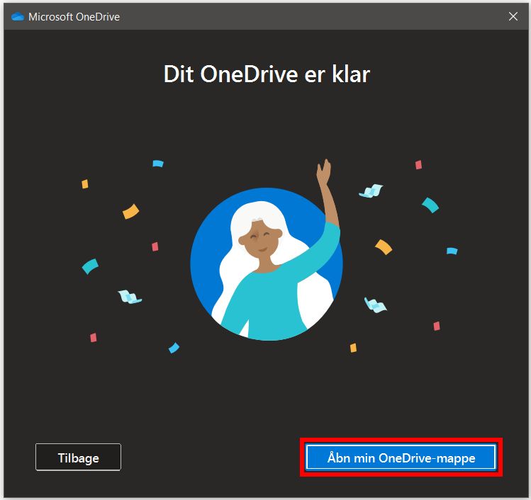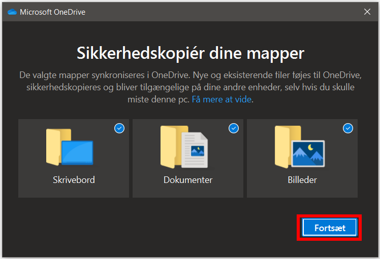 Du bliver nu ledt igennem en kort introduktion af, hvad OneDrive kan, og hvordan du bruger det. Tryk på Fortsæt, indtil du når til dette billede, og så er OneDrive konfigureret, og dine filer synkronisereres!