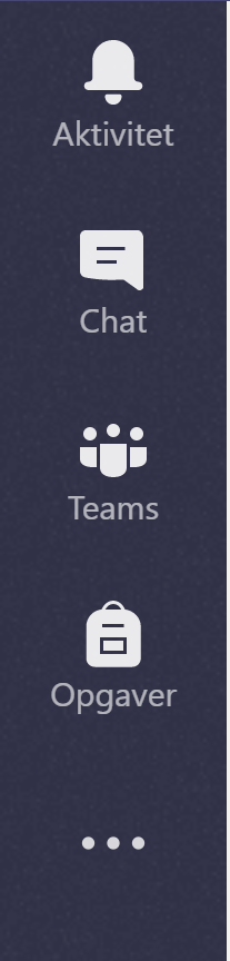 I venstre side af vinduet er en række knapper, som bruges til at navigere i de mange funktioner i Teams. Her er en gennemgang, af hvad der er bag knapperne.