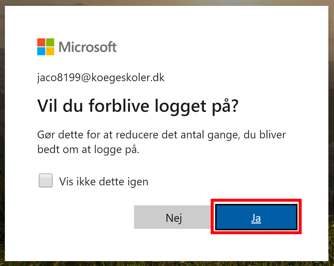 Du vil nu komme videre til den velkendte boks til Unilogin. Her indtastes brugernavn og adgangskode som sædvanligt. Hvis det lykkedes, vil den spørge, om du vil forblive logget på. Svar Ja til dette, med mindre du arbejder på en computer, der ikke er din